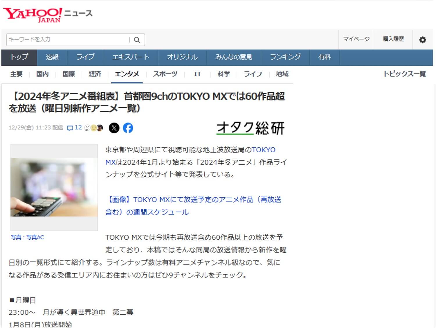 ■掲載媒体Yahoo!ニュース【2024年冬アニメ番組表】首都圏9chのTOKYO MXでは60作品超を放送(曜日別新作アニメ一覧)(オタク総研) – Yahoo!ニュース