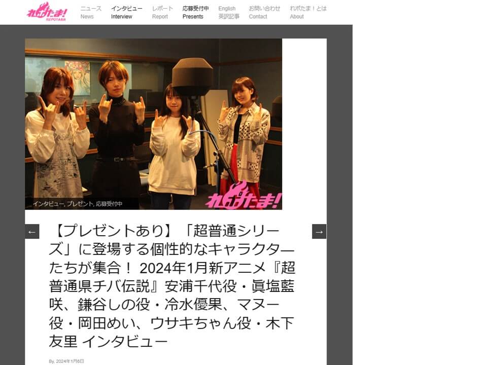 ■掲載媒体れポたま!【プレゼントあり】「超普通シリーズ」に登場する個性的なキャラクタ―たちが集合! 2024年1月新アニメ『超普通県チバ伝説』安浦千代役・眞塩藍咲、鎌谷しの役・冷水優果、マヌー役・岡田めい、ウサキちゃん役・木下友里 インタビュー – れポたま! (repotama.com)